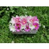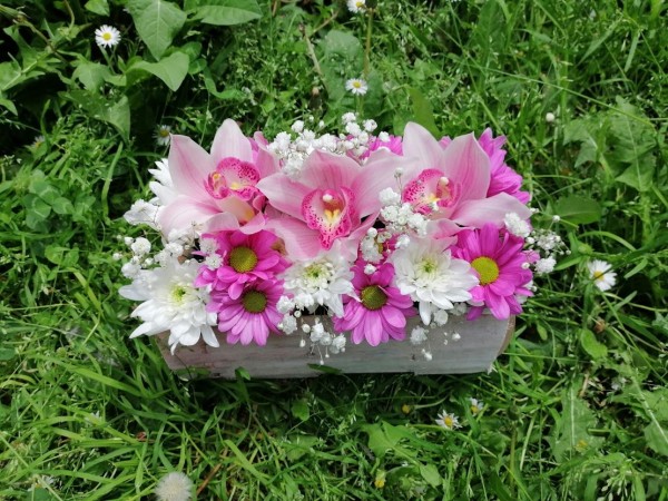 Aranžman u panju Hrizantema,Orhideja i Šlajer sa propratnim zelenilom