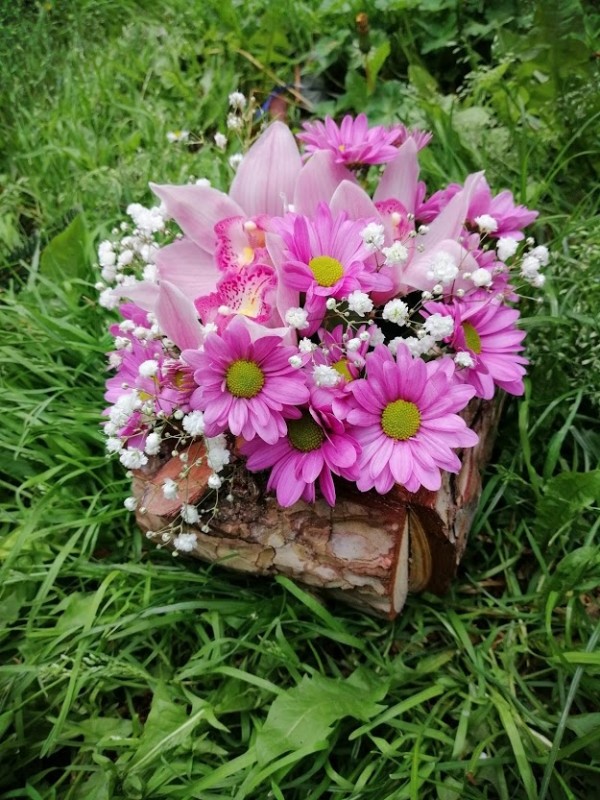 Aranžman u panjicu Orhideja i Hrizantema sa propratnim zelenilom