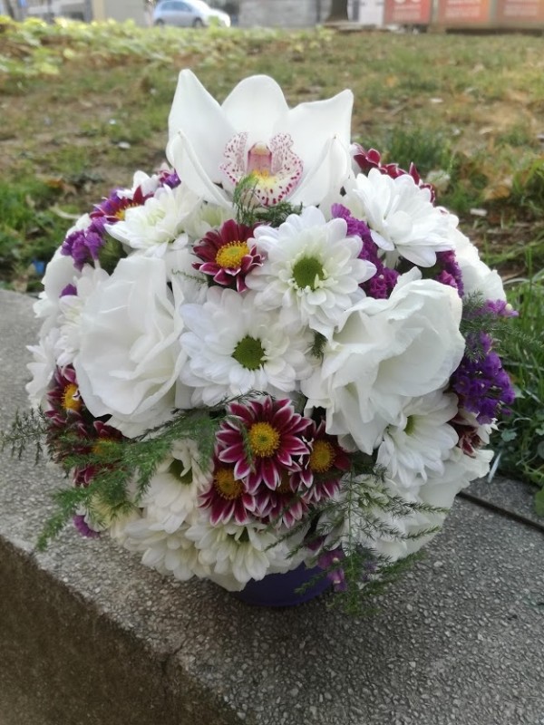 Aranžman u obliku lopte Hrizantema,Orhideja i Lizijantus