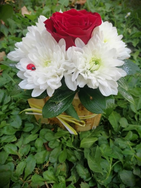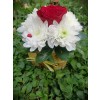 Aranžman u panjicu Hrizantema i Ruža.
