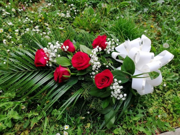 Buket šest ruža,šlajer,palma i propratno zelenilo.