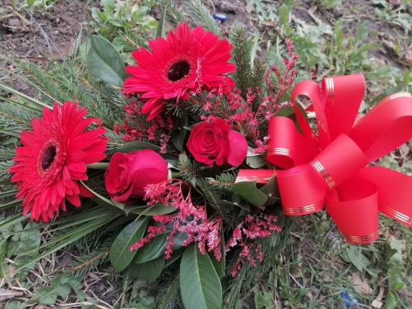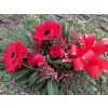 Buket dva gerbera, dve ruže,šlajer, palma i propratno zelenilo