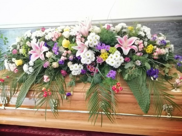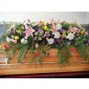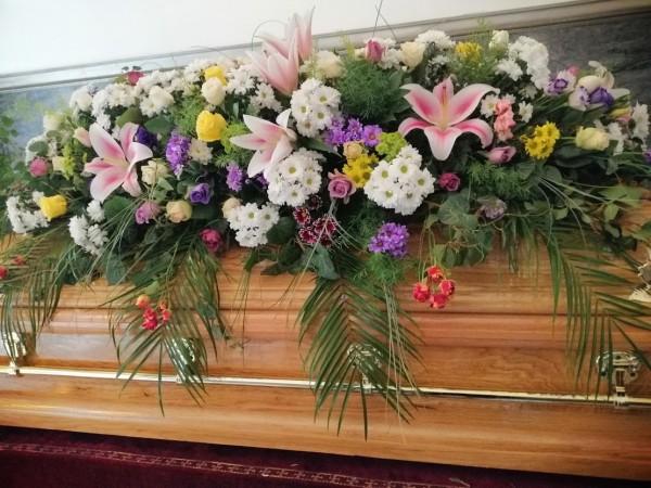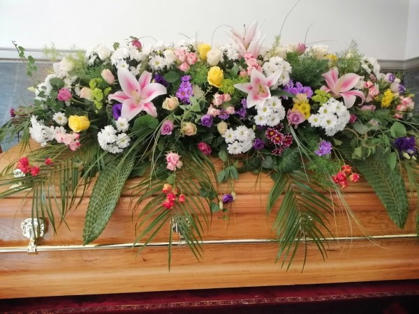 Ikebana Ljiljan,Hrizantema,Ruža,mini Ruža ,Palma,pletena Palma,Lizijantus i propratno zelenilo