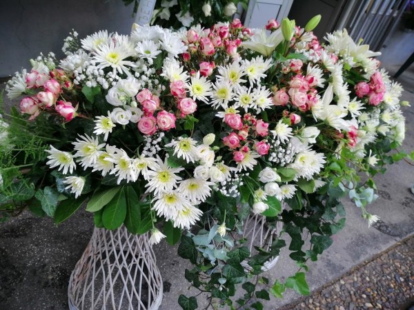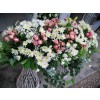 Ikebana mini Ruža ,Lizijantus,Hrizantema,Šlajer,Ljiljan sa propratnim zelenilom