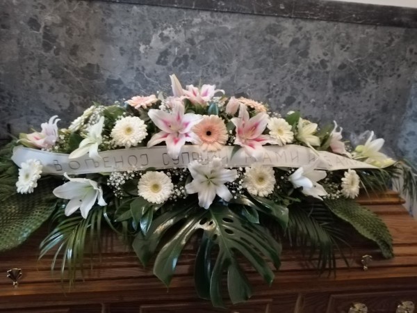 Ikebana Kazablanka,Ljiljan,Gerber,Mostera,pletena palma i propratno zelenilo