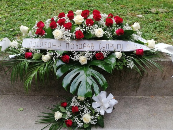 Ikebana Ruže i Šlajer sa propratnim zelenilom i buket za krst