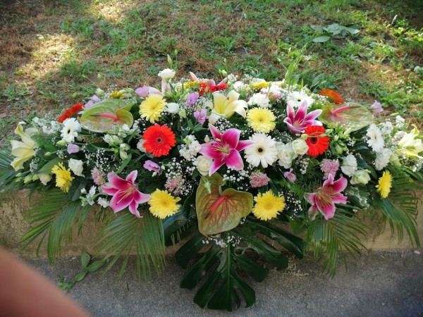 Ikebana Ljiljan,Gerber,Kazablanka,Astromerija,Lizijantus,Mostera,Plama sa propratnim zelenilom