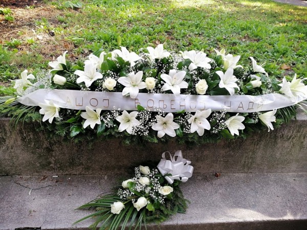 Ikebana Ljiljan,Ruža,Šlajer sa propratnim zelenilom sa buketom za krst