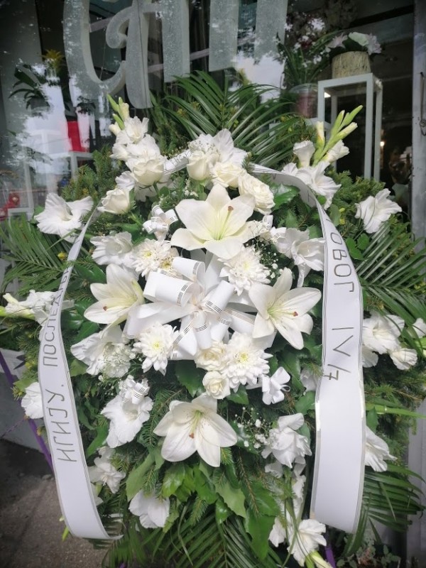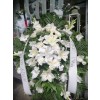 Venac od mesanog belog cveća sa propratnim zelenilom.